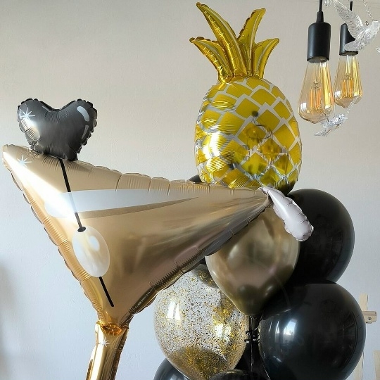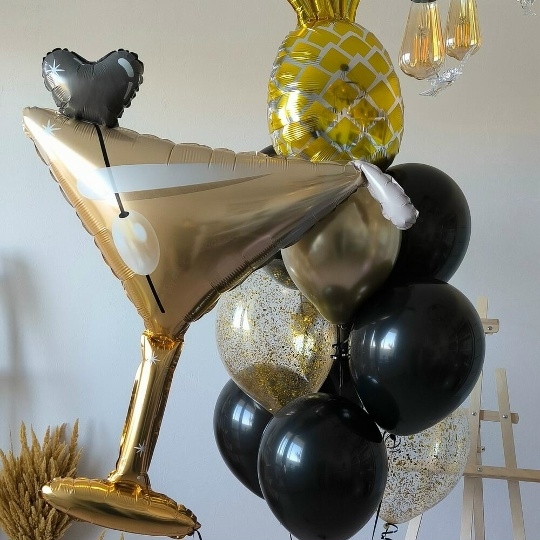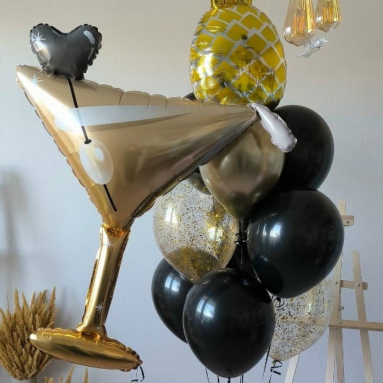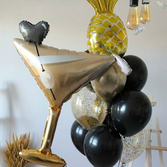 В набор входит Шар ананас 79 см Шар бокал мартини 104 см Шар латекс 30/35 см черный 6 шт Шар хром 30/35 см золото 1 шт Шар кристалл 30/35 см золото 2 шт Груз 2 шт ✨ Устройте незабываемый праздник с тропическим шиком! Набор Тропический коктейль – это взрыв ярких эмоций и стильных фотографий! 🥂🍍 Фольгированный бокал мартини, сочный ананас, блеск золота и игривое конфетти создадут атмосферу роскоши и веселья. Идеально для дня рождения, девичника или просто для поднятия настроения! Описание: Погрузитесь в атмосферу праздника с нашим эксклюзивным набором шаров Тропикано! Этот набор – идеальный выбор для стильной и современной девушки, ценящей оригинальность и яркие эмоции. В состав набора входят: * Фольгированный шар Бокал мартини: Добавит нотку гламура и изысканности. 🥂 * Фольгированный шар Ананас: Привнесет тропическую свежесть и яркость. 🍍 * Шары черные: Создадут элегантный контраст и подчеркнут роскошь композиции. 🖤 * Шары с конфетти: Добавят игривости и праздничного настроения. 🎉 * Шар хром золото: Придаст блеска и шика. ✨ * Фонтан из шаров: Эффектная композиция из черных, золотых шаров с конфетти и ананаса станет центром внимания и отличным фоном для фото. Этот набор гарантированно произведет фурор и запомнится надолго! Закажите Тропикано и подарите себе и своим близким море радости! 💖 Шары для девушки, шары на девичник, воздушные шары для девушки