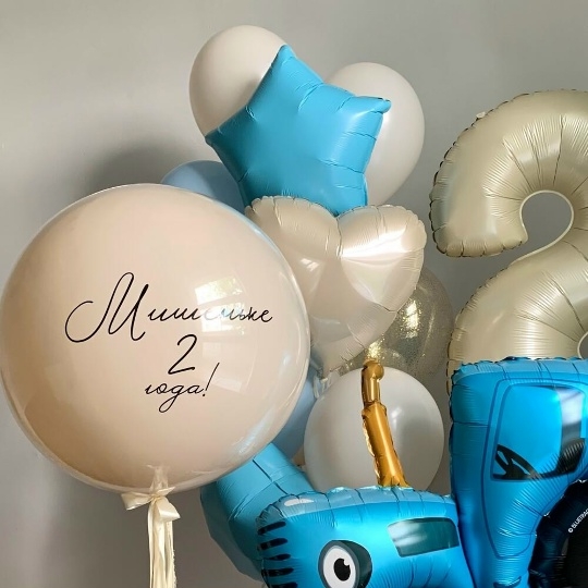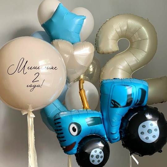 В набор входит Шар синий трактор 107 см Шар дабл 60/65 см Надпись на шар (ваш текст) Цифра 102 см крем 1 шт Шар звезда 45 см голубая 2 шт Шар сердце 45 см крем 1 шт Шар латекс 30/35 см голубой 3 шт крем 3 шт Шар кристалл 30/35 см конфетти 1 шт Груз 4 шт