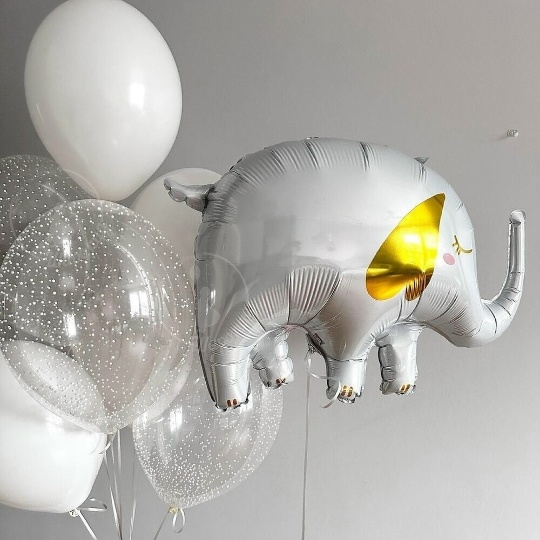 В набор входит Фигура слоник 84 см Шар латекс 30/35 см белый 4 шт Шар кристалл 30/35 см конфетти пузырьки 3 шт Груз 2 шт все шары только премиум сегмента, обработаны гелем для увеличения срока полёта, доставляются в транспортировочных пакетах.