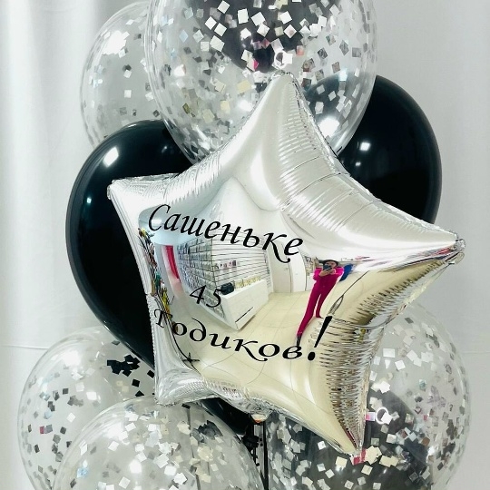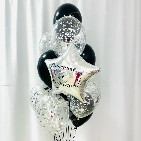 В набор входит Звезда 45 см Надпись на шар (Ваша надпись) Указывайте в комментариях Шар латекс 30/35 см черный 5 шт Шар кристалл 30/35 см конфетти серебро Груз 1 шт Все шары только премиум сегмента, обработаны гелем для увеличения срока полёта, доставляются в транспортировочных пакетах.