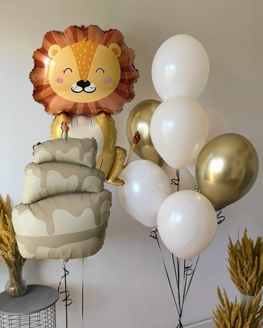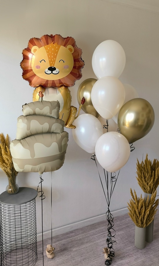 В набор входит Шар фигура Лев 🦁 102 см Шар фигура торт 🎂 96 см Шар латекс 30/35 см белый 2 шт крем 4 шт Шар хром 30/35 см золото 2 шт Груз 3 шт 🎈 Лев 🦁👑: Большой фольгированный воздушный шар в форме милого мультяшного льва, похожего на короля джунглей. 🎈 Торт 🎂🍰: Фольгированный воздушный шар в форме торта с капающим кремом, идеально подходящий для празднования дня рождения. 🎈 Белый 🤍⚪: Классические белые воздушные шары добавляют элегантный штрих к аранжировке. 🎈 Золотой ✨💛: Металлические золотые воздушные шары придают нотку гламура и блеска. 🎈 Кремовый 🍦🥚: Воздушные шары кремового цвета дополняют торт и создают мягкую и уютную атмосферу. Этот набор идеально подходит для вечеринки по случаю дня рождения с тематикой львов или сафари или любого другого праздника, который требует теплой и праздничной атмосферы. со львом, для девочки, фонтан шаров, фонтан из шаров, шары для мальчика, шары на день рождения.