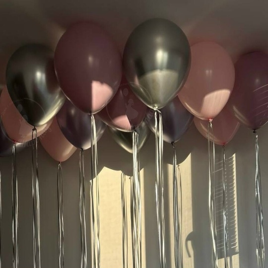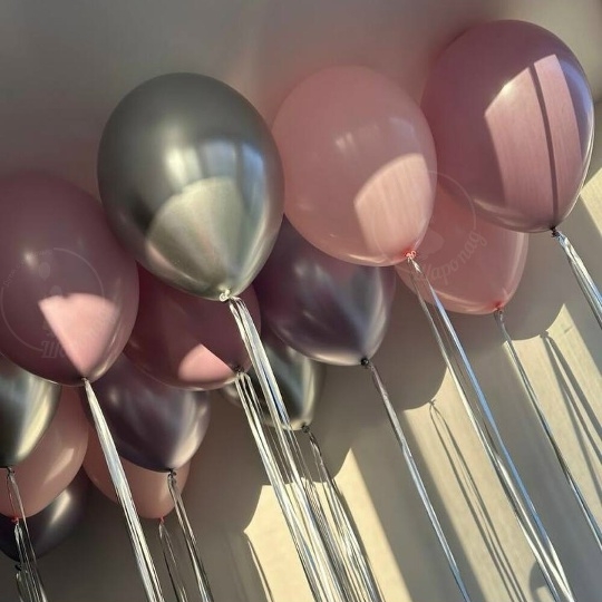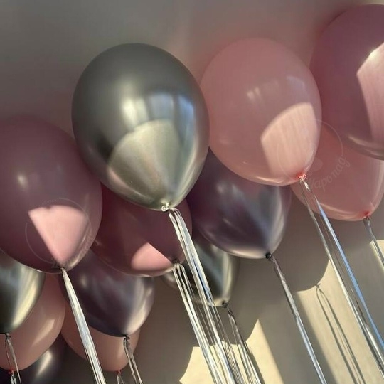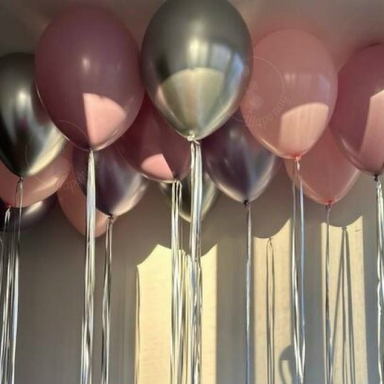 В набор входит Шар латекс 30/35 см розовый 5 шт пыльная роза 5 шт Шар хром 30/35 см серебро 5 шт Занавес дождик серебро