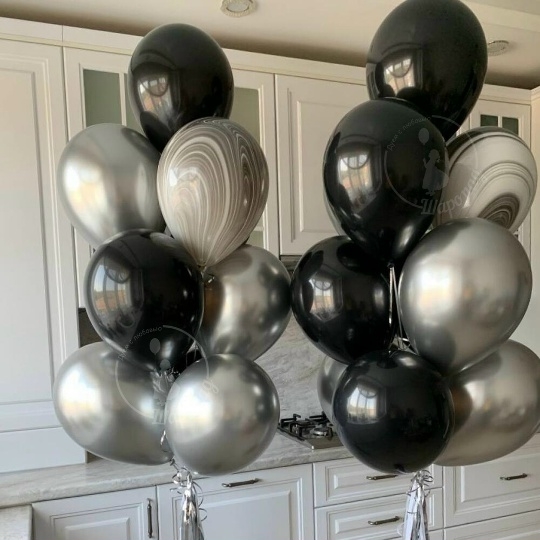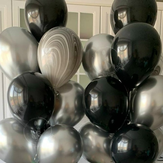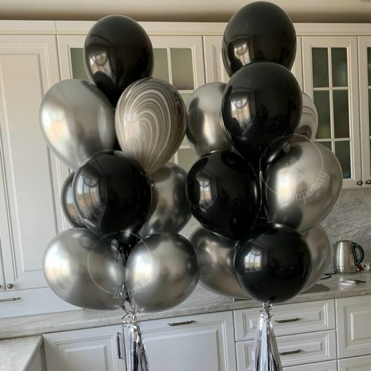 В набор входит Шар латекс 30/35 см черный 8 шт Шар агат 30/35 см черно белые 4 шт Шар хром 39/35 см серебро 8 шт Декор кисти тассел Груз 2 шт