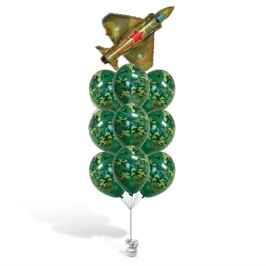 В набор входит Шар латекс 30/35 принт камуфляж 9 шт Истребитель 88 см Груз 1 шт все Шары только премиум сегмента, обработаны гелем для увеличения срока полёта, доставляются в транспортировочных пакетах.