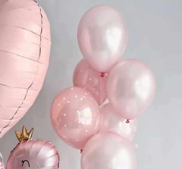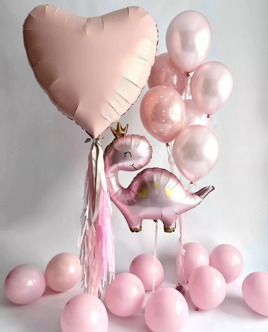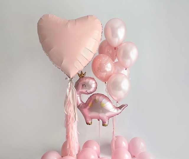 В набор входит Динозаврик розовый 96 см Сердце 76 см розовое декор Шар 30/35 см дабл стафф 6 шт розовые Шар на пол декор 25/30 см надут воздухом Груз 3 шт Время полета 2-дня