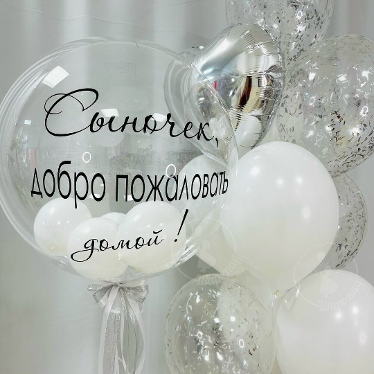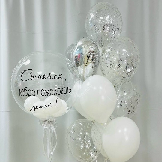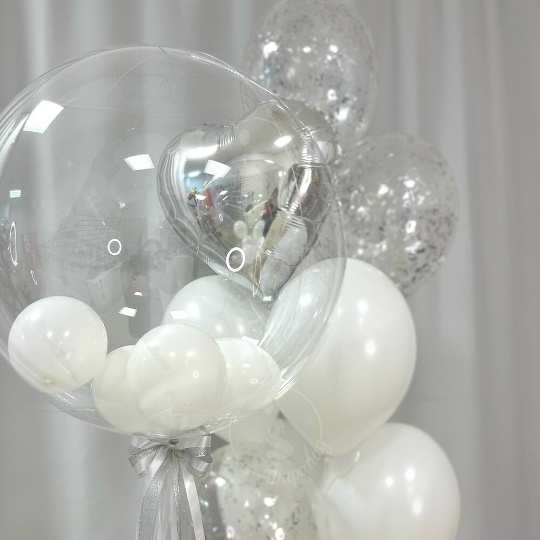 В набор входит Шар баблс 60/65 см Банки атласный Ваша надпись ( укажите в комментариях) Шар латекс 30/35 см белый 5 шт Шар кристалл 30/35 конфетти серебро 4 шт Сердце 45 см Груз 2 шт все шары только премиум сегмента, обработаны гелем для увеличения срока полёта, доставляются в транспортировочных пакетах.