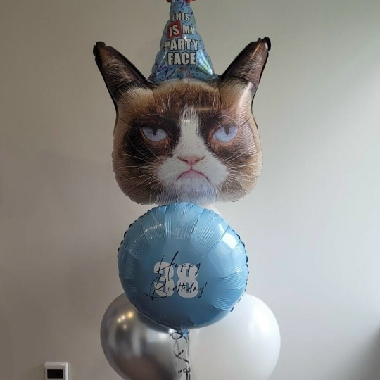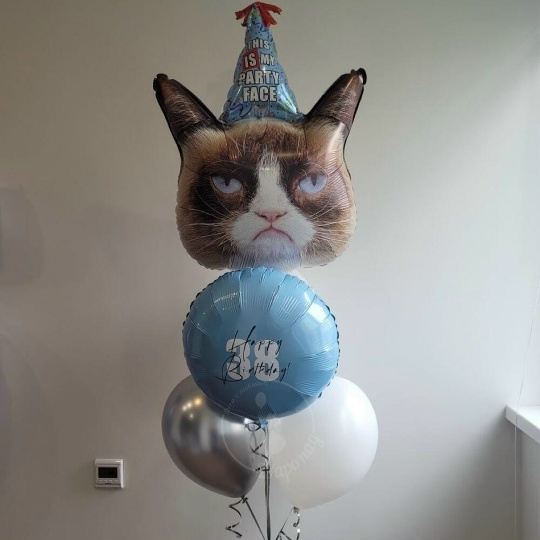 В набор входит Шар сердитая кошка Шар латекс 30/35 см белый 2 шт Шар хром 30/35 см серебро 1 шт Шар круг 45 см голубой 1 шт Надпись на шар (ваш текст) Укажите в комментариях возраст именинника 🥳 Груз 1 шт