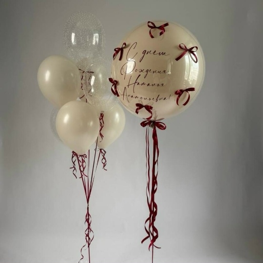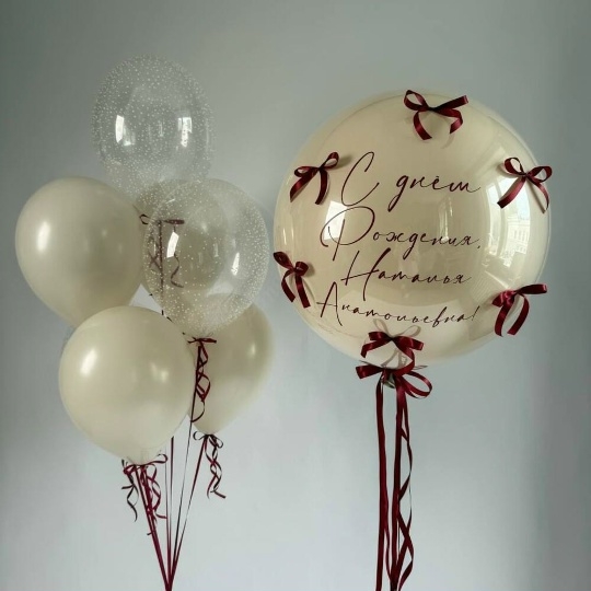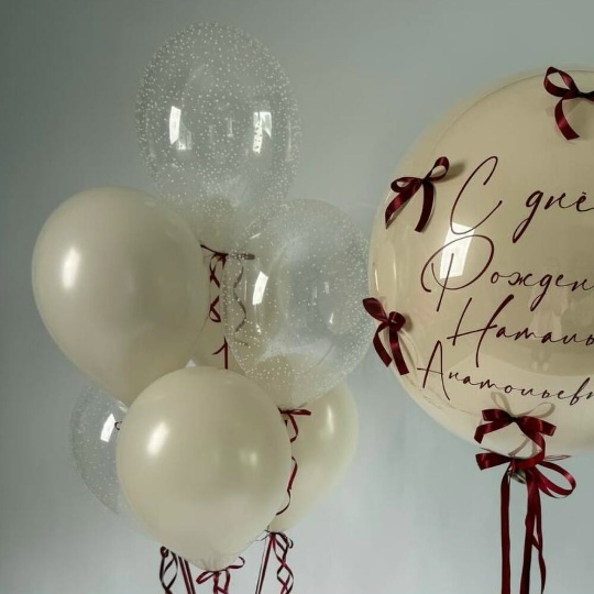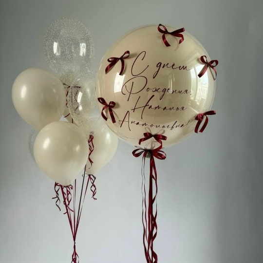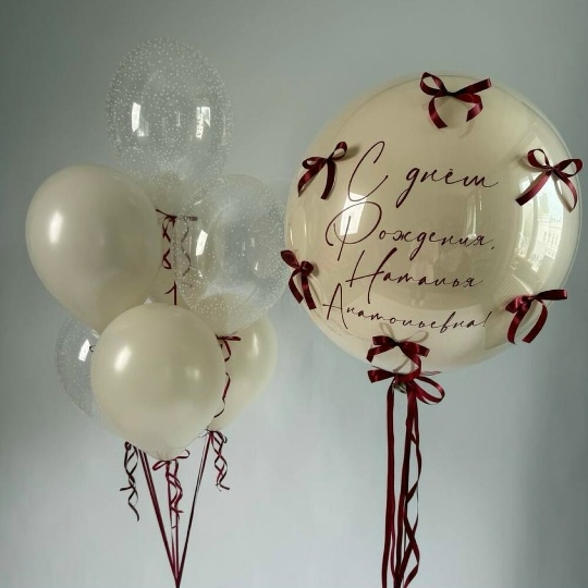 В набор входит Шар дабл стафф 60/65 см крем Надпись на шар (ваш текст) Декор бантики Шар латекс 30/35 см крем 4 шт Шар кристалл 30/35 см конфетти пузырьки 3 шт Груз 2 шт Название: Набор воздушных шаров Бархат 🎈✨ Описание: Погрузитесь в атмосферу роскоши и тепла с эксклюзивным набором воздушных шаров Бархат! Этот элегантный сет, вдохновленный благородством и мягкостью бархатной ткани, станет незабываемым подарком и украшением любого торжества. 👑 Главный акцент композиции – огромный шар-бабл, дабл стафф украшенный изысканной персонализированной надписью (например, С днём рождения, Наталья Анатольевна! ✍️) и миниатюрными бархатными бантиками цвета марсала. 🎀 Его дополняет нежный фонтан из гелиевых шаров: благородные перламутровые шары цвета слоновой кости 🤍, напоминающие мягкий бархат, и искрящиеся прозрачные шары с мерцающим наполнением, создающие эффект невесомой дымки. ✨ Длинные, струящиеся ленты глубокого бордового цвета 🍷 добавляют композиции торжественности и элегантности, словно ниспадающие складки дорогой ткани. ❤️ Этот набор идеально подойдёт для создания незабываемого праздника, будь то день рождения, юбилей или любой другой особенный повод, где хочется подчеркнуть изысканный вкус и внимание к деталям. 🎁🎉 Ключевые слова для поиска: Бархат, воздушные шары с надписью, шары баблс с бантами, кремовые шары, бордовые шары, шары марсала, шары айвори, элегантные шары, роскошные шары, шары на день рождения, юбилейные шары, гелиевые шары, прозрачные шары с конфетти, шары с глиттером, премиум шары, стильные шары, доставка шаров, оформление праздника, шары для девушки, шары для женщины, шары с персонализацией, изысканный подарок, шар гигант с надписью, шар дабл стафф, шар баблс, фонтан шаров, шары с бантиками, шары для девушки, шары на день рождения, крем шар, шары постель, шары дешево, шары с доставкой СПБ.