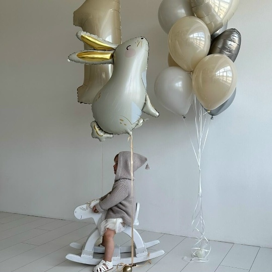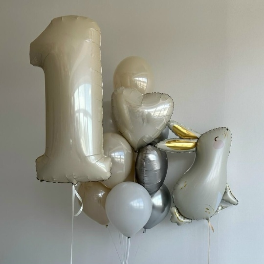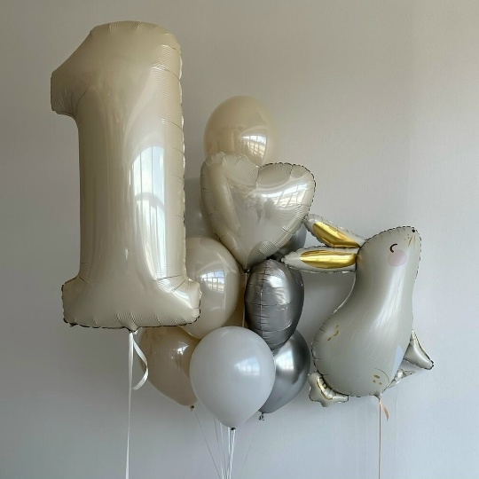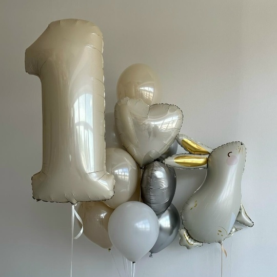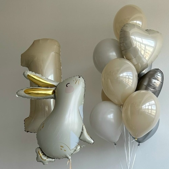 В набор входит Цифра 102 см крем Шар зайка золотые ушки 74 см Шар латекс 30/35 см белый 2 шт Шар дабл стафф 30/35 см крем 4 шт Шар хром 30/35 см серебро 2 шт Шар сердце 45 см крем 1 шт серебро Сатин 1 шт Груз 3 шт