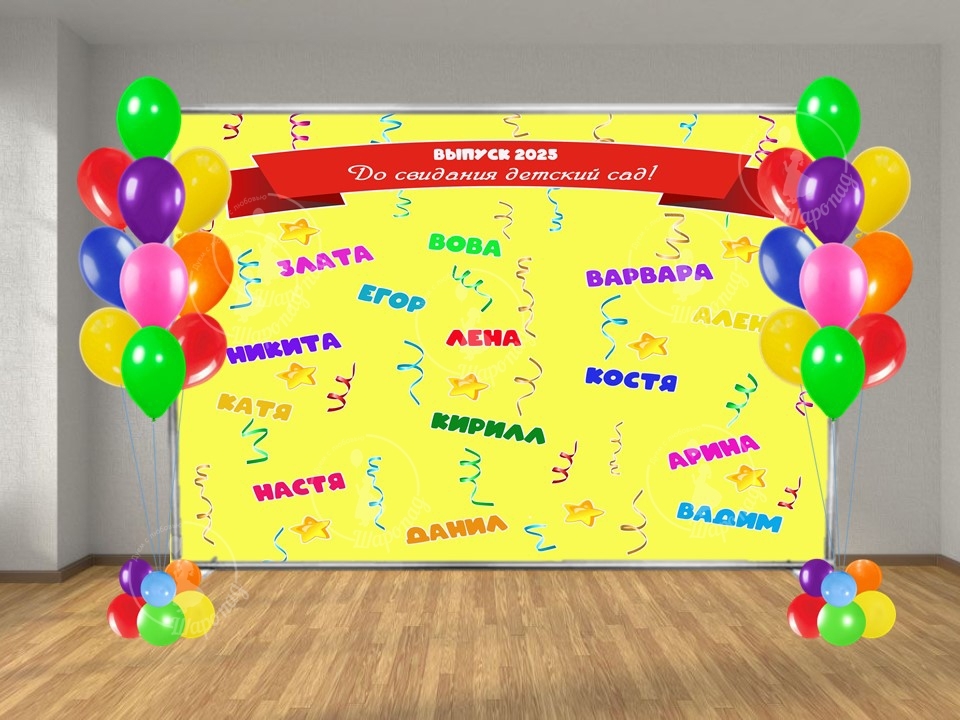1. Фон: • Цвет: Ярко-желтый фон, символизирующий радость, солнечное настроение и позитив. Желтый цвет создает атмосферу праздника и веселья. 2. Надпись: • Текст: В центре баннера размещена надпись «Выпускной детского сада!» или «Поздравляем наших выпускников!». • Имена детей: Под основной надписью можно разместить имена выпускников, написанные в разных цветах, чтобы подчеркнуть индивидуальность каждого ребенка. 3. Декоративные элементы: • Фонтаны из шаров: С обеих сторон баннера стоят два фонтана из шаров ассорти. Каждый фонтан состоит из 10 шаров различных цветов (например, красные, синие, зеленые, розовые и фиолетовые). Баннер будет выглядеть ярко и привлекательно, создавая радостное настроение для всех участников выпускного. Он станет отличным фоном для фотографий и подчеркнет важность этого события для детей и их родителей!