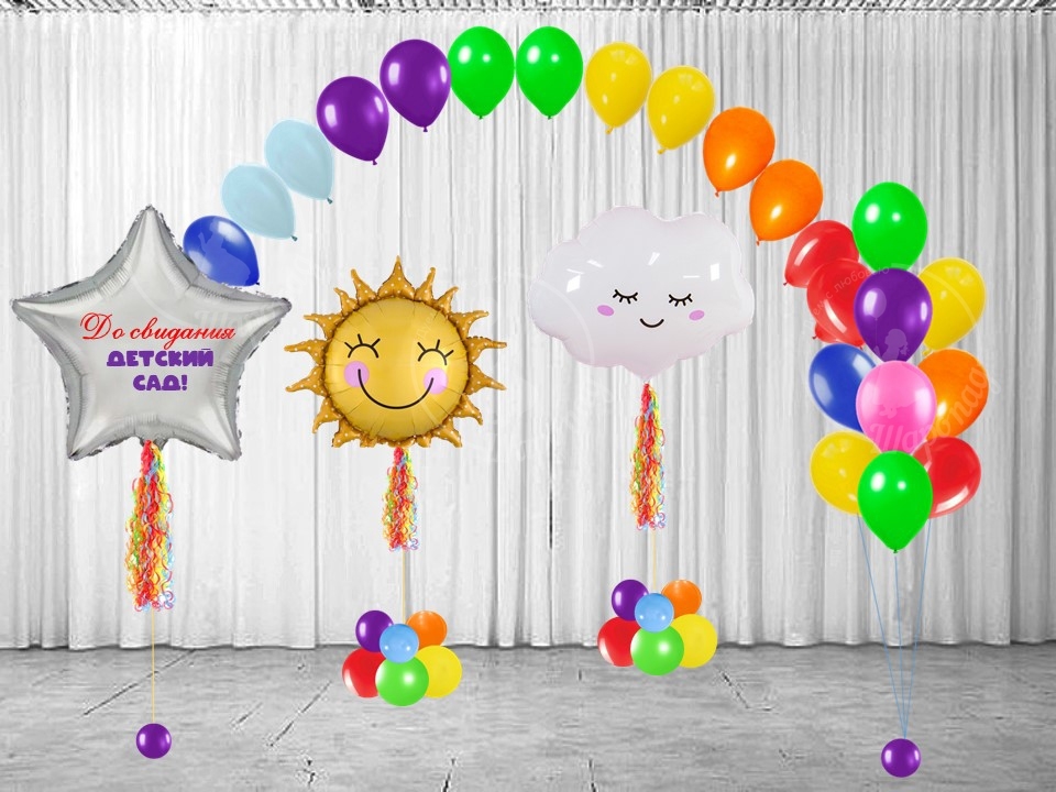 Этот яркий и красочный идеально подходит для выпускного вечера в детском саду. Он включает в себя большие фольгированные фигуры, такие как звезда, солнце и облако, а также фонтан из разноцветных шаров и гирлянду, создавая веселую и праздничную атмосферу. 1. Большая звезда (90 см): • Яркая фольгированная звезда размером 90 см. Она выполнена в золотом или серебряном цвете с блестящей поверхностью, что привлекает внимание. • На звезде размещена праздничная надпись, например: "Поздравляем!" или "Выпускной 2025", что добавляет особый смысл и делает ее центральным элементом декора. 2. Фигура из фольги "Солнце": • Яркое солнце с улыбающимся лицом и лучами, выполненное из фольги. Оно создает атмосферу тепла и радости, символизируя новое начало и светлое будущее для выпускников. 3. Фигура из фольги "Облако": • Мягкое облако из фольги, которое дополняет солнечную тему. Облако может быть белым или голубым, создавая ощущение легкости и воздушности. • Эта фигура добавляет игривости в общий декор. 4. Фонтан из 10 разноцветных шаров: • Фонтан состоит из 10 латексных шаров различных цветов (красный, синий, желтый, зеленый, розовый и оранжевый), создавая яркий визуальный акцент. 5. Гирлянда из разноцветных шаров: • Гирлянда состоит из множества латексных шаров разных цветов, собранных в единую композицию. Набор станет ярким акцентом в оформлении зала для выпускного вечера, создавая атмосферу праздника и веселья. Большие фольгированные фигуры и фонтан из шаров создадут отличное место для фотографий, где дети и родители смогут запечатлеть этот важный момент.