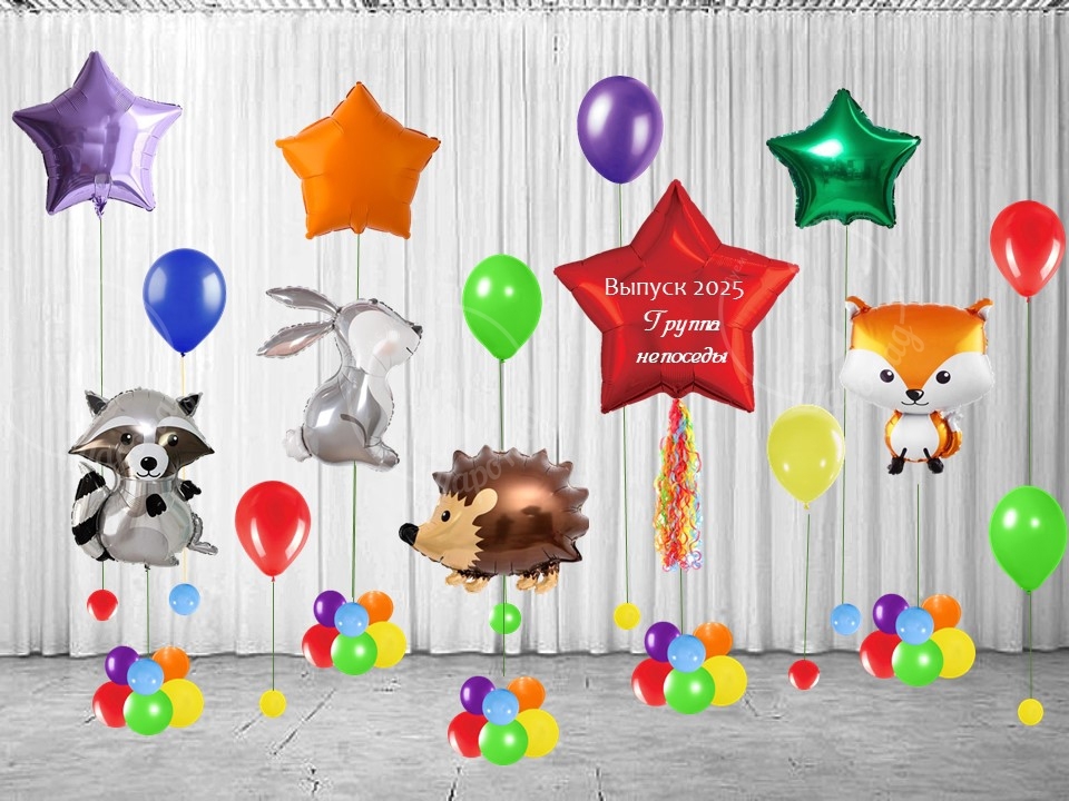 1. Большая красная звезда из фольги (90 см): • Яркая красная звезда размером 90 см станет центральным элементом декора. Ее блестящая поверхность и насыщенный цвет создадут эффектный акцент на выпускном вечере, символизируя радость и праздник. • На звезде можно разместить поздравительную надпись, например: "Поздравляем с выпуском!" или "Выпускной 2025", что добавит особый смысл и сделает ее еще более значимой для детей и родителей. 2. Зеленая звезда из фольги надутая гелием: • Эта звезда добавит свежести и яркости в оформление. Зеленый цвет ассоциируется с природой и новыми начинаниями, что идеально подходит для празднования окончания детского сада. 3. Оранжевая звезда из фольги надутая гелием: • Оранжевая звезда привнесет в атмосферу теплоту и позитив. Этот цвет создает ощущение веселья и энергии, что сделает праздник еще более запоминающимся. 4. Фиолетовая звезда из фольги надутая гелием: • Фиолетовая звезда добавит загадочности и волшебства. Этот цвет часто ассоциируется с мечтами и фантазией, что идеально подходит для детского праздника. 5. 7 латексных шаров ассорти, надутых гелием: • В набор входят 7 латексных шаров различных ярких цветов (например, красный, синий, желтый, зеленый, розовый), которые будут плавать в воздухе, создавая веселую атмосферу. 6. Фигуры из фольги: • В набор входят милые фольгированные фигуры животных надутые гелием: ёжик, заяц, енот и лиса. Эти персонажи добавят игривости и оригинальности в оформление. • Каждая фигура выполнена в ярких цветах и станет отличным дополнением к общему декору, создавая атмосферу сказки и веселья. Этот набор станет ярким акцентом в оформлении зала для выпускного вечера, создавая атмосферу веселья и праздника. Большие звезды и фигуры животных создадут отличное место для фотографий, где дети и родители смогут запечатлеть этот важный момент.