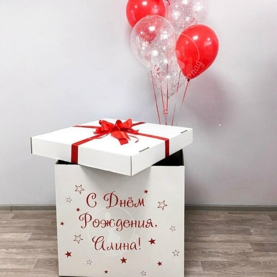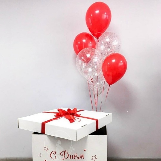 Коробка 60/60 Бант атласный Надпись на коробку 60/60 Шар латекс 30/35 см красный 3 шт Конфетти золото 30/35 см 3 шт