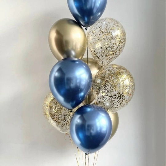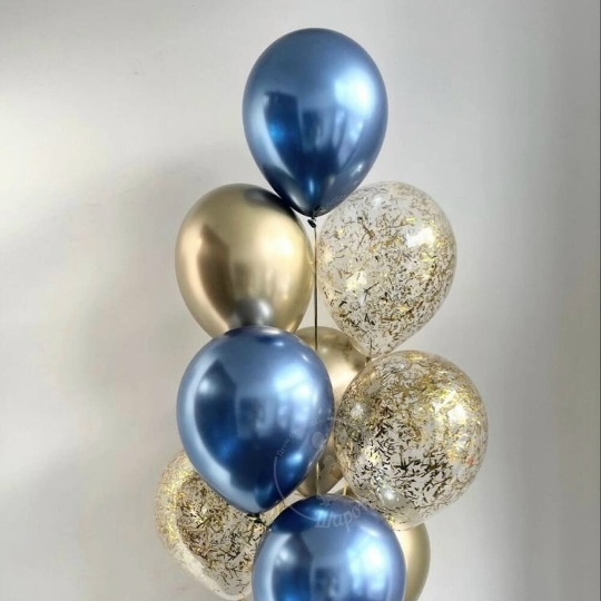 В набор входит Шар хром 30/35 см синий 3 шт золото 3 шт Шар конфетти золото 4 шт Груз 1 шт Гарантия полета 2-е суток Все шары обработаны