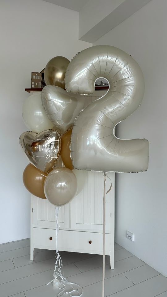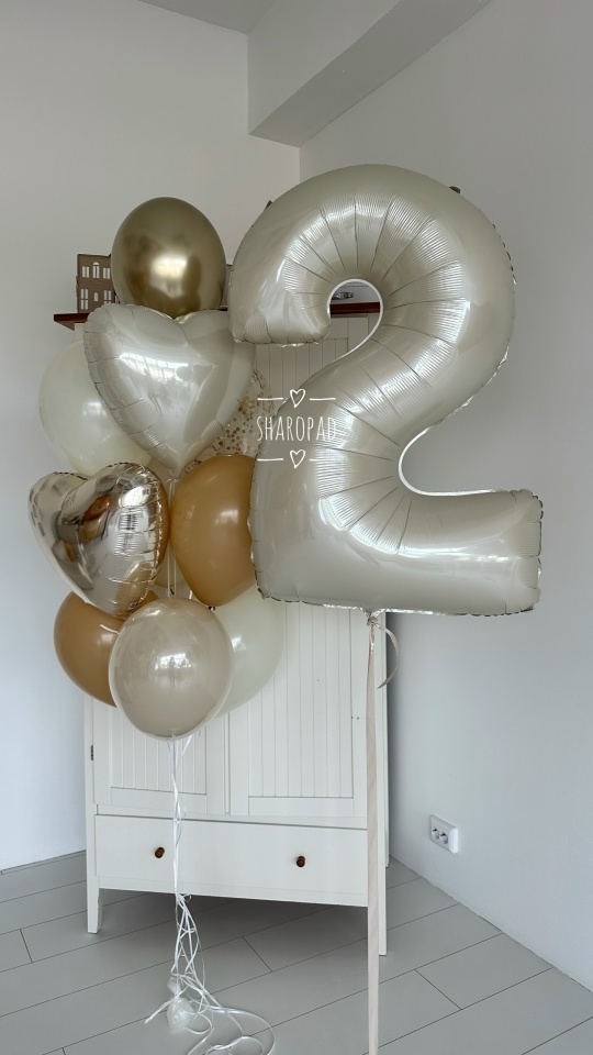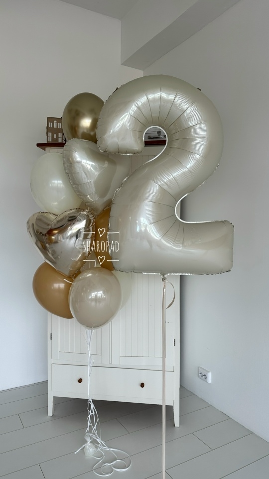 В набор входит Цифра 102 см крем Сердце 45 см шампань 1 шт белый блеск 1 шт Шар латекс 30/35 см коричневый 2 шт Шар дабл стафф 30/35 см крем 2 шт пыл роза 2 шт Шар хром 30/35 см золото 1 шт Шар кристалл 30/35 см конфетти золото 1 шт Груз 2 шт