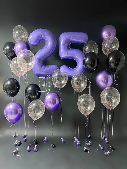 В набор входит Цифра 102 см лаванда 2 шт Шар хром 30/35 см лаванда 5 шт Шар кристалл 30/35 см конфетти пузырьки 10 шт Шар латекс 30/35 см черный 5 шт Груз 22 шт Все Шары только премиум сегмента, обработаны гелем для увеличения срока полёта, доставляются в транспортировочных пакетах.