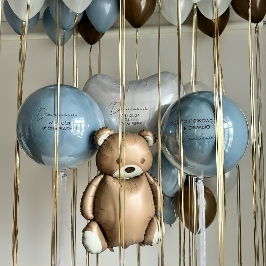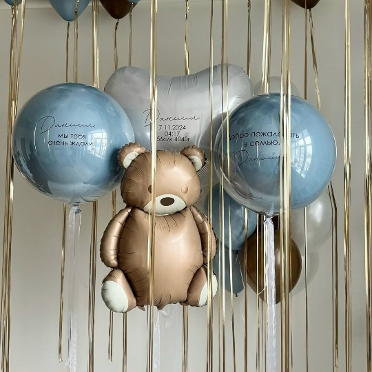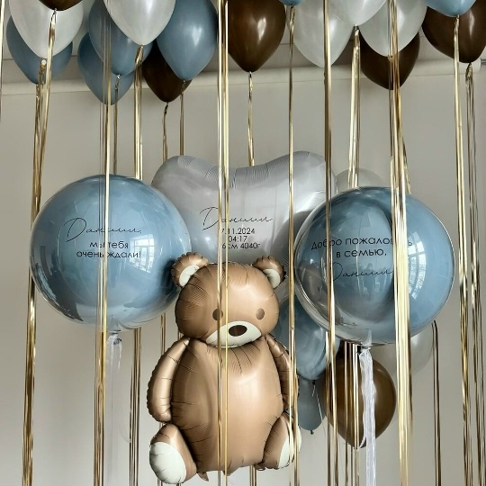 В набор входит 20 шт Шар латекс 30/35 см шоколад 6 шт голубой 8 шт белый металлик 6 шт Декор дождик Фонтан из шаров шоколад 2 шт голубой 2 шт белый 3 шт Шар дабл стафф 60/65 см ретро голубой 2 шт Надпись на шар (ваш текст) Сердце 76,5 см белый блеск Надпись на сердце (МЕТРИКА) Груз 5 шт
