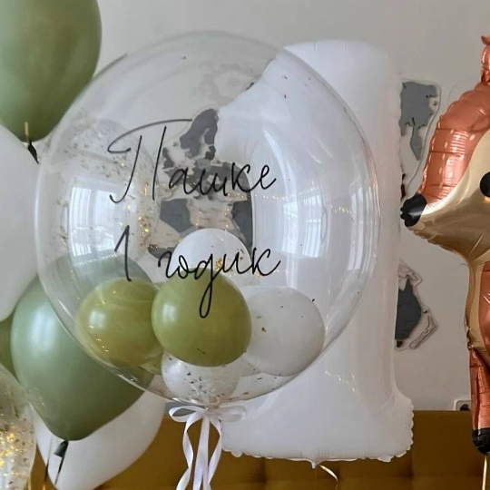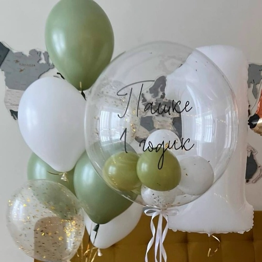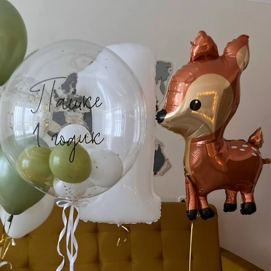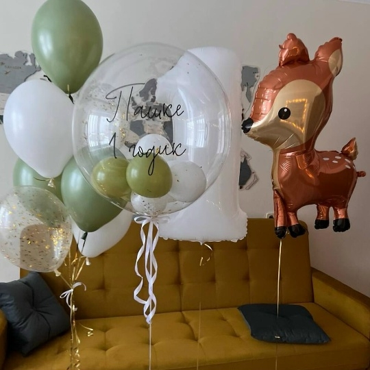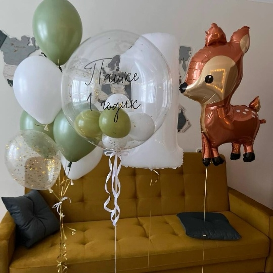 В набор входит Шар баблс 60/65 см с наполнением Надпись на шар (ваш текст) Шар цифра 102 см белая Шар фигура 104 см олененок Шар латекс 30/35 см эвкалипт 3 шт белый 2 шт Шар кристалл 30/35 см конфетти 2 шт Груз 3 шт