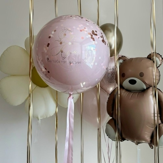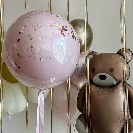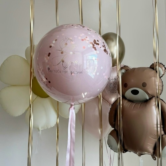 В набор входит Шар дабл стафф 60/65 см конфетти Надпись на шар (ваш текст) Шар фигура мишка 89 см Шар фигура ромашка Шар сердце 45 см розовое Метрика малыша я(ваш текст) Шар латекс 30/35 см пыльная роза 6 шт Шар хром 30/35 см золото 5 шт Груз 4 шт , с мишкой, выписка из роддома, выписка девочки, шары на выписку