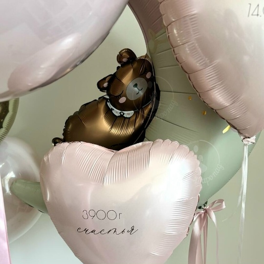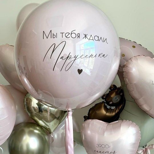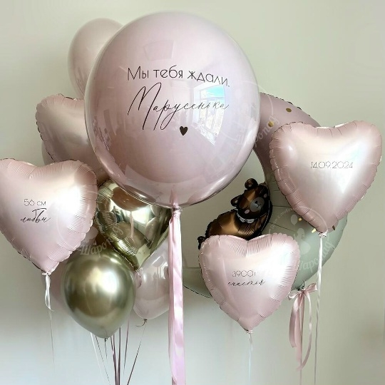В набор входит Шар дабл стафф 60/65 см пыльная роза Надпись на шар (ваш текст) Месяц с мишкой 98 см Сердце 45 см пыл роза 4 шт шампань 1 шт (метрика малышки) Шар дабл стафф 30/35 см пыльная роза 3 шт Шар латекс 30/35 см пыльная роза 3 шт Шар хром 30/35 см золото 1 шт Груз 5 шт