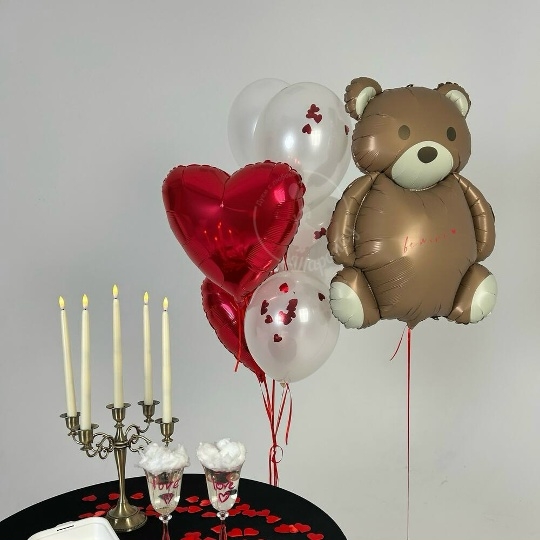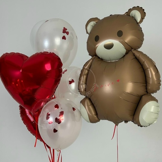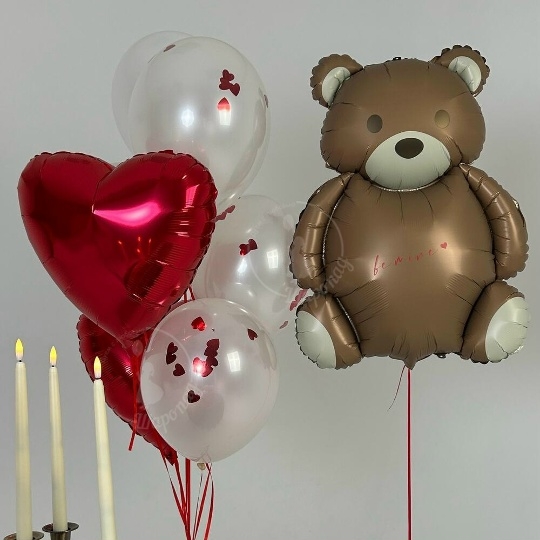 В набор входит Мишка крем 83 см Сердце 45 см красное 2 шт Шар дабл стафф 30/35 см металлик с конфетти 5 шт Все Шары только премиум сегмента, обработаны гелем для увеличения срока полёта, доставляются в транспортировочных пакетах.