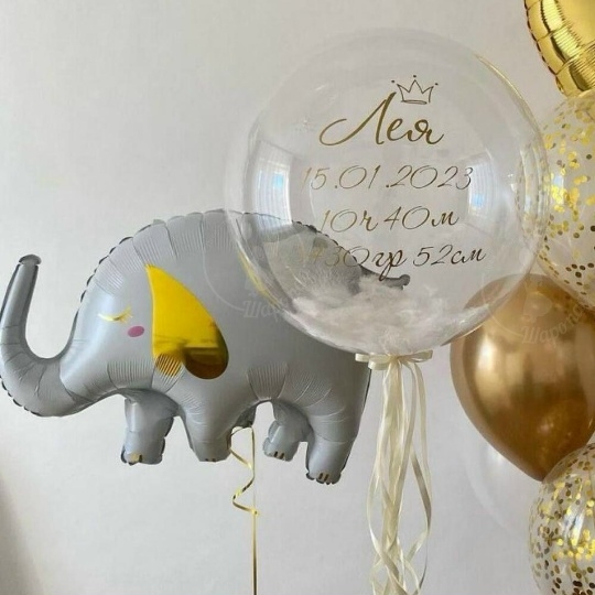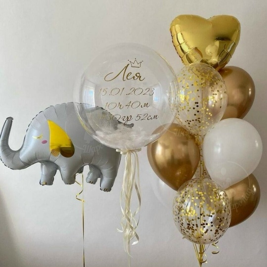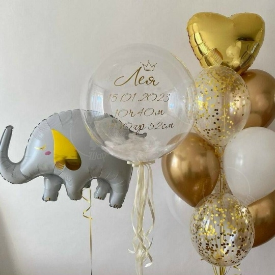 В набор входит Фигура слоник 84 см Шар баблс 60/65 см с наполнением перьев надпись на шар (ваш текст) Сердце 45 см золото 1 шт Шар латекс 30/35 см белый 3 шт Шар хром 30/35 см золото 3 шт Шар кристалл 30/35 см конфетти золото 3 шт Груз 3 шт ▎для выписки из роддома для девочки Поздравьте с рождением вашей маленькой принцессы! Наш эксклюзивный для выписки из роддома — это идеальный способ отметить этот важный момент в вашей жизни. В набор входит: • Шар-слоник белого цвета (84 см) с золотым принтом сердечко — символизирует нежность и радость, станет ярким акцентом на вашем празднике. • Шар-баблс (60/65 см) с текстом метрики малышки — персонализированный элемент, который добавит уникальности вашему событию и станет замечательным украшением для фотосессии. • Фонтан из шаров с конфетти, хромом, золотом и белым цветами — создаст атмосферу волшебства и радости, идеально подходящую для встречи новорожденной. ▎Почему стоит выбрать наш набор? • Качество: Все шары изготовлены из высококачественных материалов, которые долго сохраняют форму и радуют яркими цветами. • Индивидуальность: Персонализированная метрика на шаре делает ваш праздник уникальным и запоминающимся. • Легкость в использовании: Набор готов к использованию, вам нужно лишь развязать шары и наслаждаться праздником! Создайте незабываемую атмосферу в день выписки вашей малышки! Закажите наш прямо сейчас и подарите себе и своим близким радость и счастье в этот особенный день! все шары только премиум сегмента, обработаны гелем для увеличения срока полёта, доставляются в транспортировочных пакетах.
