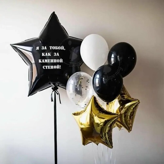 В набор входит Звезда 76 см черная Надпись на шар 76 см (ваш текст) Шар латекс 30/35 см черный 2 шт белый 2 шт Шар кристалл 30/35 см конфетти 1 шт Груз 2 шт все шары только премиум сегмента, обработаны гелем для увеличения срока полёта, доставляются в транспортировочных пакетах.