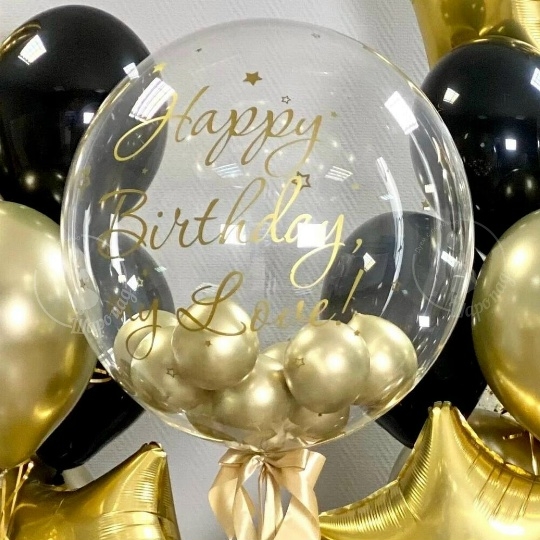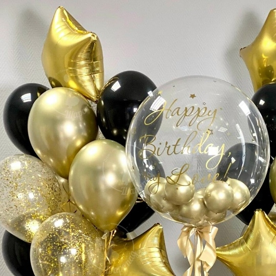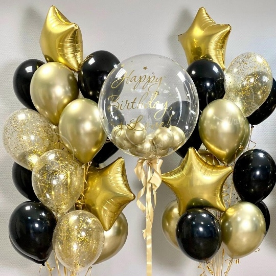 В набор входит Шар баблс 60 см с наполнением Надпись на шар 30 см Укажите свою надпись в коментариях Шар кристалл 30/35 см 8 шт + конфетти Шар латекс 30/35 см черные 10 шт Шар хром 30/35 см золото 12 шт Звезда 45 см золото 4 шт Индивидуальная надпись на шар 60 см Груз 3 шт Лента атласная бант Все Шары только премиум сегмента, обработаны гелем для увеличения срока полёта, доставляются в транспортировочных пакетах.
