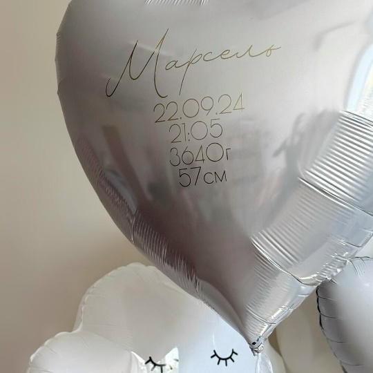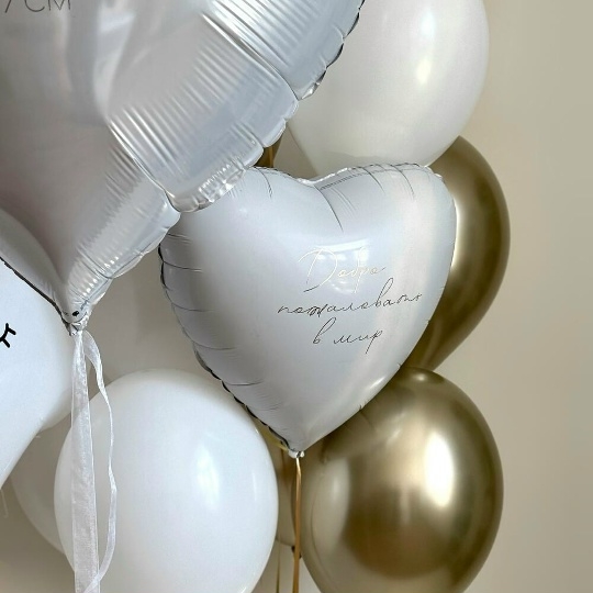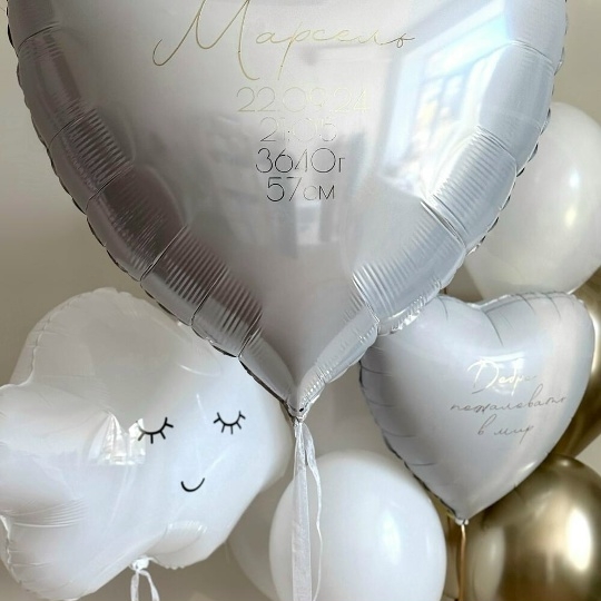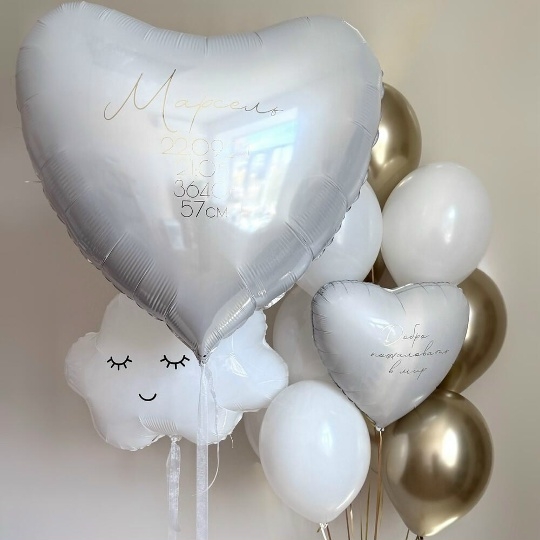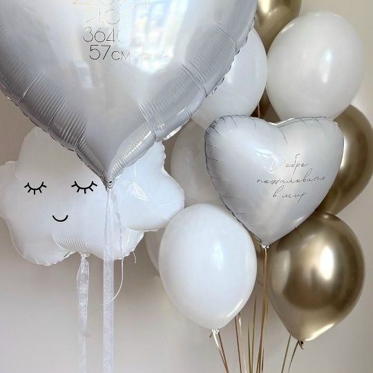 В набор входит Шар сердце 76,5 см белое Надпись на шар (ваш текст) Шар облако 69 см Шар латекс 30/35 см белое 5 шт Шар хром 30/35 см золото 4 шт Шар сердце 45 см белое 1 шт Груз 3 шт Выписка из роддома, шары на выписку, выписка девочки, выписка мальчика.