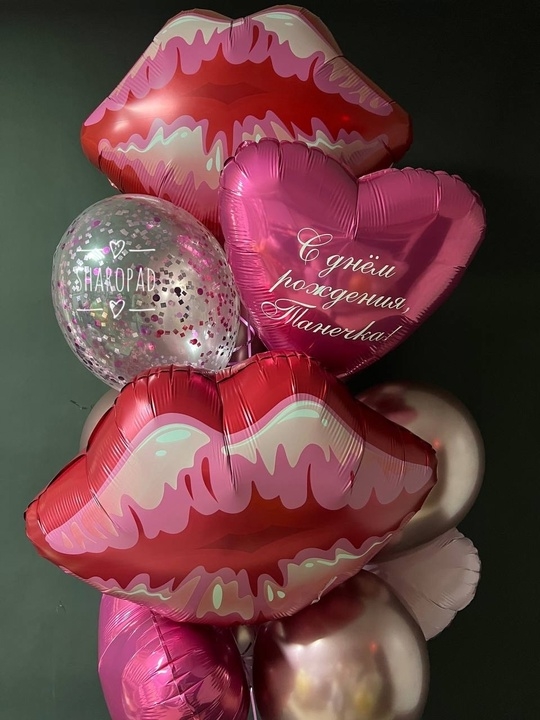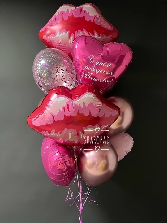 В набор входит Надпись на шар (ваш текст) Губы 76 см 2 шт Сердце 45 см Пинк 1 шт фуксия 3 шт Шар хром 30/35 см роз золото 4 шт Шар кристалл 30/35 см конфетти фуксия 3 шт Груз 1 шт Все Шары только премиум сегмента, обработаны гелем для увеличения срока полёта, доставляются в транспортировочных пакетах.