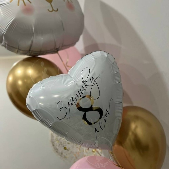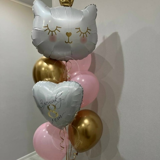 В набор входит Голова кошки 76 см Шар пастель 30/35 см розовый 3 шт Шар хром 30/35 см золото 2 шт Сердце 45 см белое Надпись на шар 45 см Груз 1 шт Время полета 2-дня