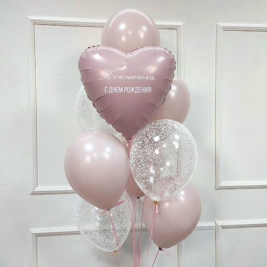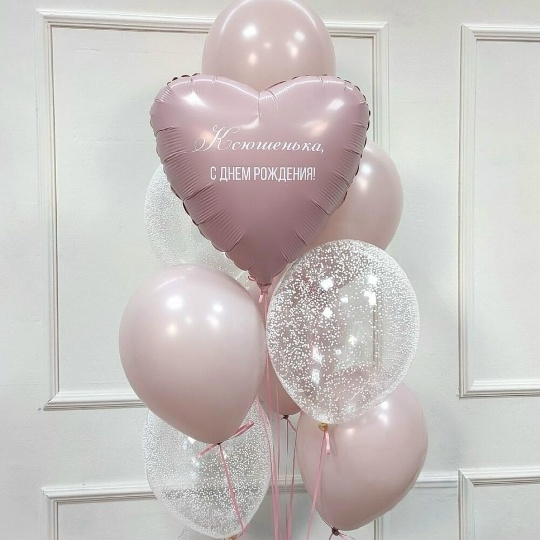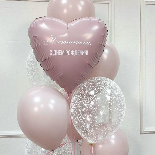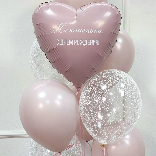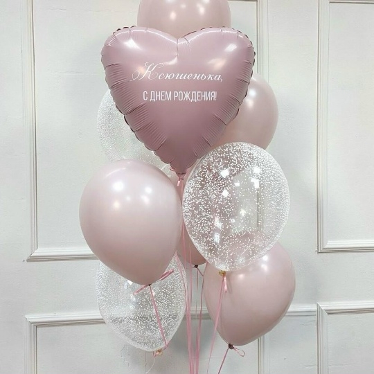 В набор входит Шар сердце 45 см пыльная роза Надпись на шар (ваш текст) Шар латекс 30/35 см роза 5 шт Шар кристалл 30/35 см пузырьки 4 шт Груз 1 шт