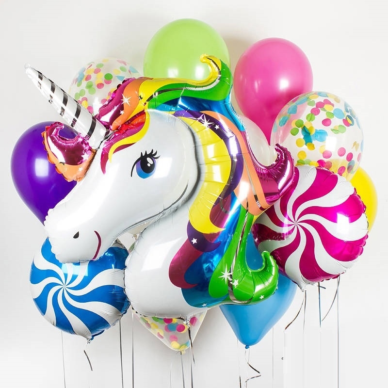 В набор входит Голова Единорога 33/83 см Шар латекс 30/35 см ассорти розовый желтый голубой Шар конфетти 30/35 см 3 шт Шар 35/40 см круг карамель 2 шт красный синий Груз в наборе все Шары только премиум сегмента, обработаны гелем для увеличения срока полёта, доставляются в транспортировочных пакетах.