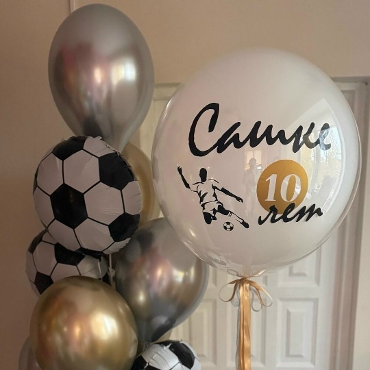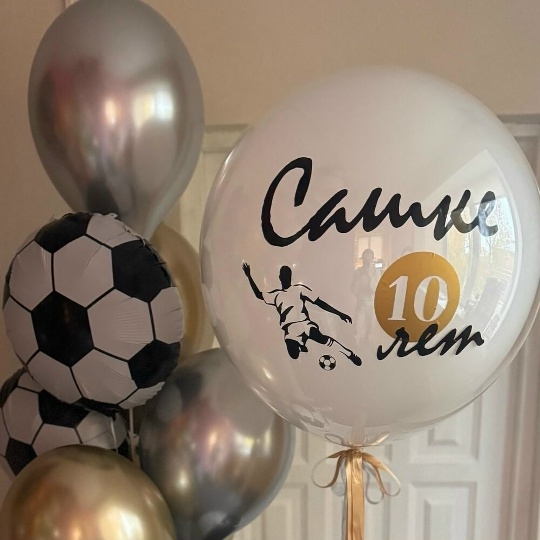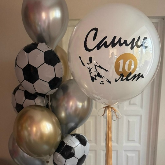 В набор входит Шар дабл 60/65 см Надпись на шар (ваш текст) Принт футболист Шар 45 см принт футбол 3 шт Шар хром 30/35 см серебро 3 шт золото 3 шт Груз 2 шт Название набора: Гооол! ⚽️🎉 Описание: Забей гол в сердце именинника с нашим ярким набором шаров Гооол! ⚽️🎉! Этот набор – настоящий праздник для юного футболиста! ⚽️🏃♂️ Представьте: огромный фольгированный футбольный мяч ⚽ парит под потолком, словно застывший в кульминации победного удара! Рядом с ним – весёлые черно-белые шары, как настоящие футбольные мячи! ⚫⚪ А ещё – блестящие золотые и серебряные звёзды ✨, словно символизирующие будущие победы и достижения! И, конечно же, главный элемент – персонализированный шар с именем и возрастом именинника! 🎉 Сделайте день рождения вашего чемпиона незабываемым с набором Гооол! ⚽️🎉! Он станет ярким акцентом праздника и подарит море радости и веселья! 🥳 Шары для мальчика, для мальчика, шары в стиле футбол, Смайлики: ⚽️🎈🎉🥅🥇🏆👦🏃♂️🌟✨⚫⚪🥳