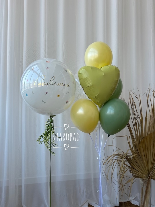 В набор входит Шар стекло 60/65 см с декором Шар латекс 30/35 см эвкалипт 2 шт Шар дабл 30/35 см лимон 2 шт Шар конфетти 30/35 см 2 шт Сердце 45 см лимон 1 шт Ветка рускуса Груз 2 шт