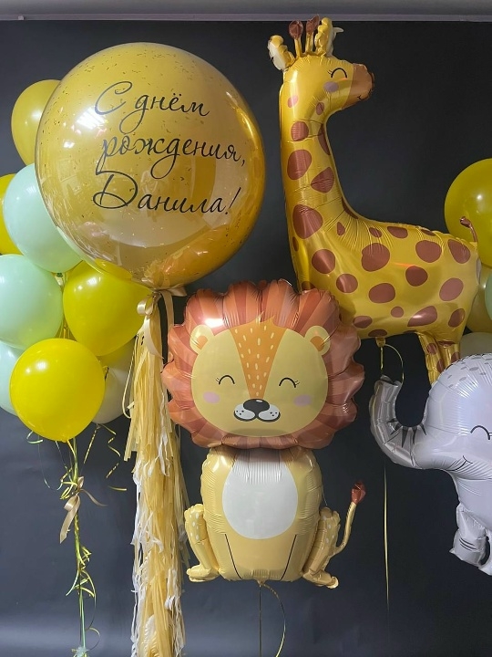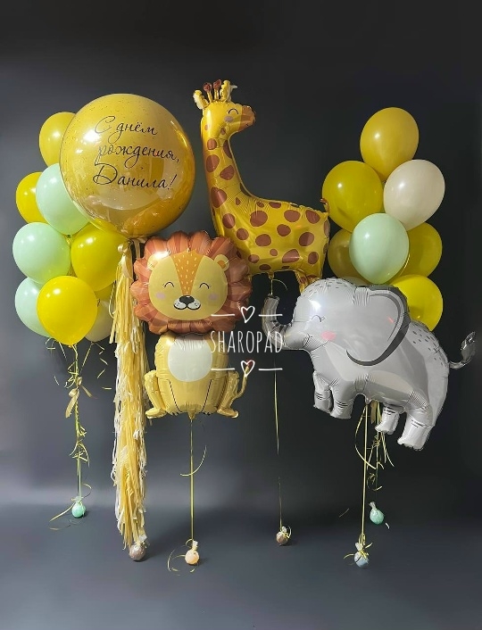 В набор входит Шар стекло 60/65 см горчица Надпись на шар (ваш текст) Декор хвост тишью Лев 102 см Жираф 94 см Слон 84 см Шар латекс 30/35 см желтый 10 шт киви 10 шт Груз 6 шт Все Шары только премиум сегмента, обработаны гелем для увеличения срока полёта, доставляются в транспортировочных пакетах.