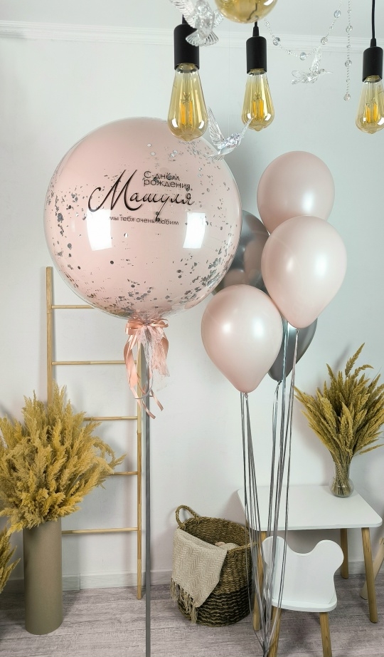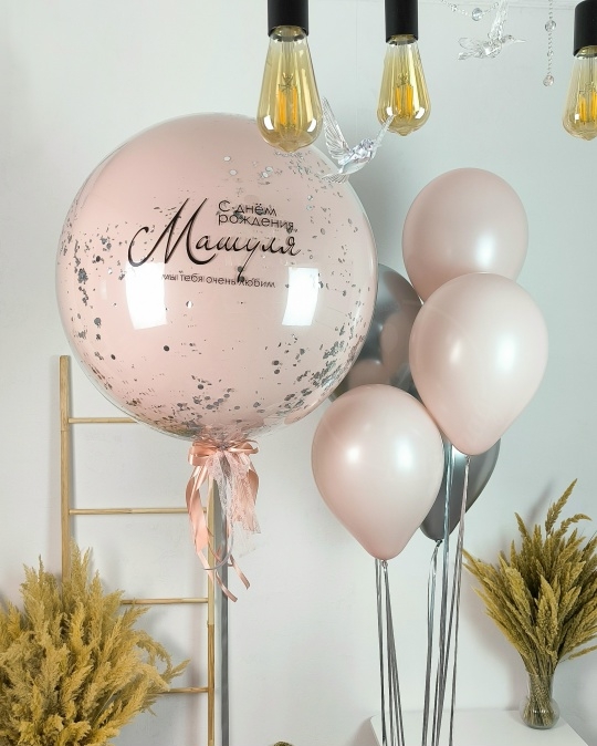 В набор входит Шар дабл Стафф 60/65 см Надпись на шар (ваш текст) Декор в шар конфетти серебро Шар латекс 30/35 см пыльная Роза 3 шт Шар хром 30/35 см серебро 2 шт Груз 2 шт