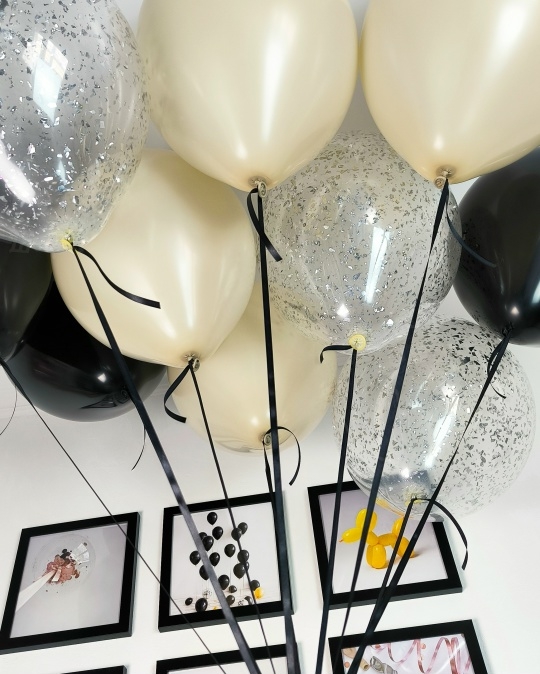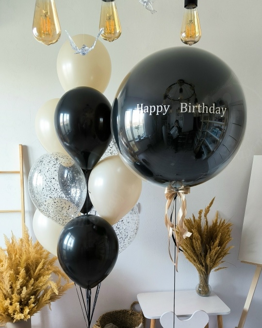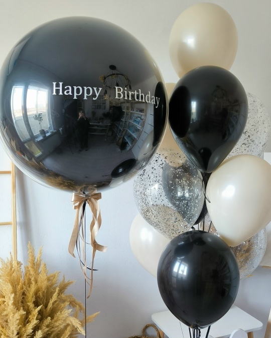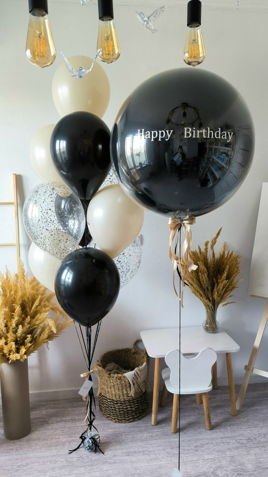 В набор входит Шар дабл стафф 60/65 см Надпись на шар (ваш текст) Шар латекс 30/35 см крем 4 шт черный 3 шт Шар кристалл 30/35 см конфетти серебро 3 шт Груз 2 шт Черный граф 🖤