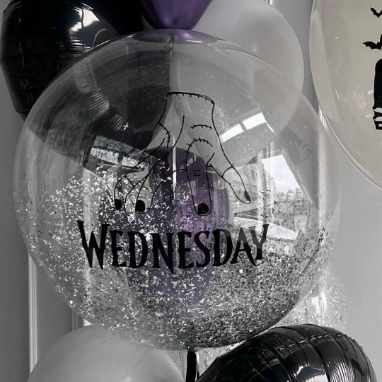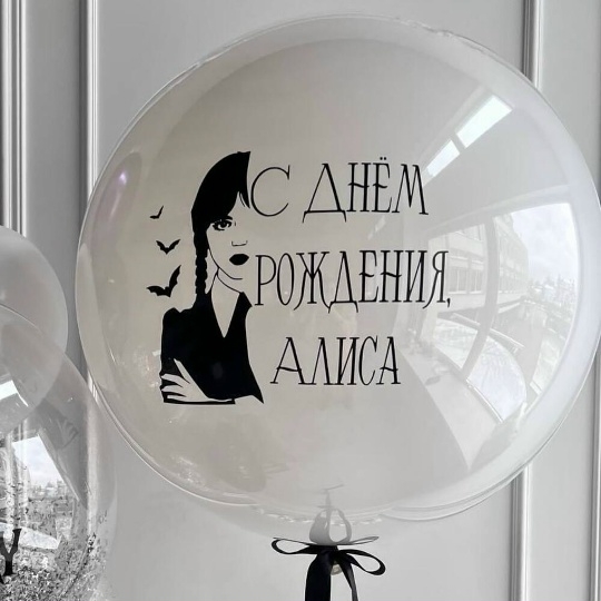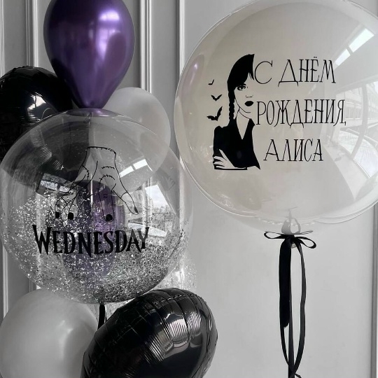 В набор входит Шар стекло 60/65 см Принт на шар Надпись на шар (ваш текст) Шар хром 30/35 см лаванда 2 шт Шар латекс 30/35 см белый 2 шт Шар круг 45 см черный 2 шт Шар кристалл 30/35 см конфетти 1 шт Груз 2 шт Шары для девочек, шары для девочки, воздушные шары венздей, воздушные шары для девочек