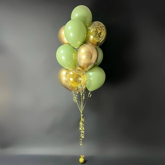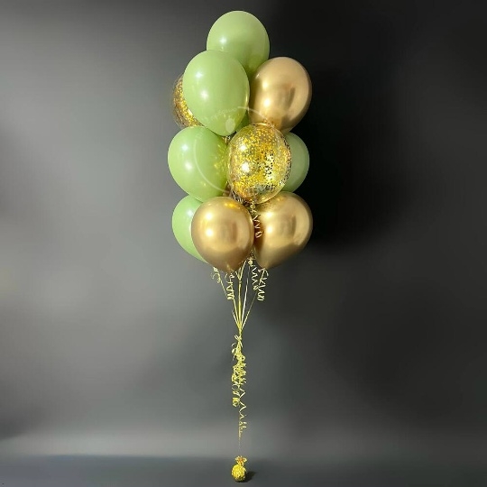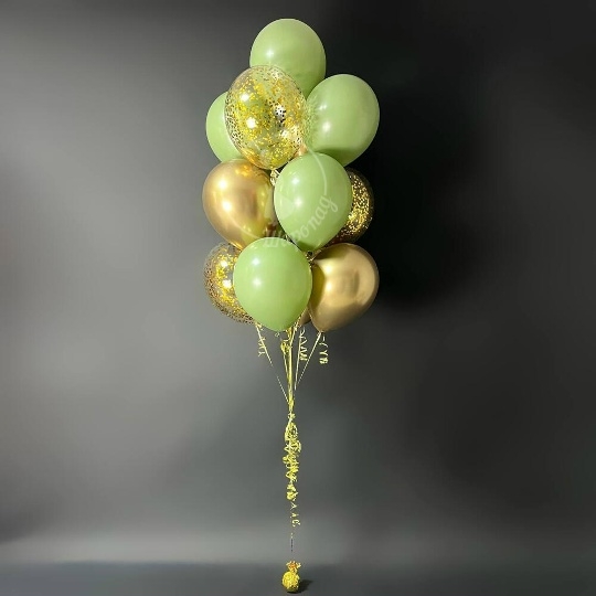 В набор входит Шар латекс 30/35 см киви 5 шт Шар хром 30/35 см золото 4 шт Шар кристалл 30/35 см золото 3 шт Груз 1 шт