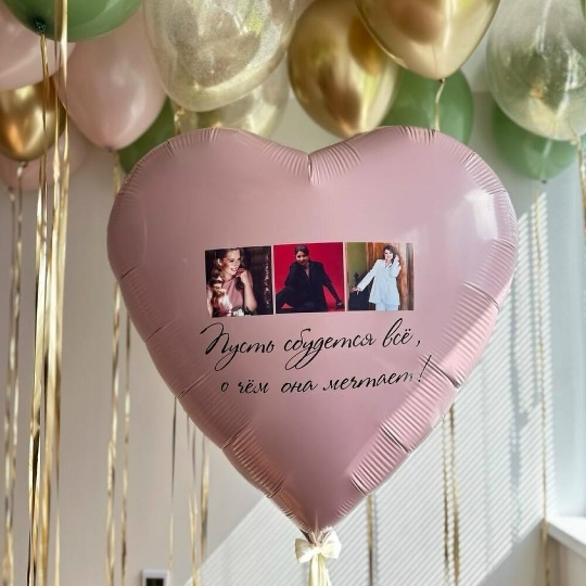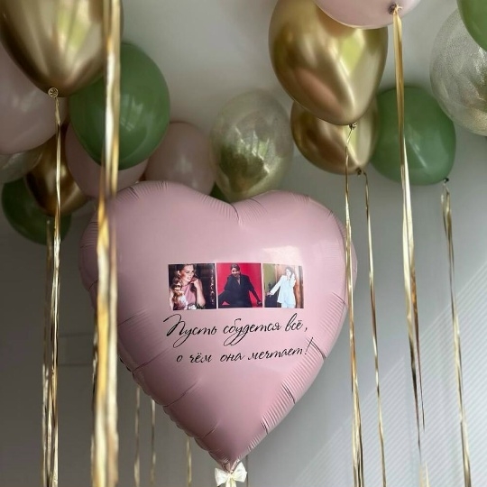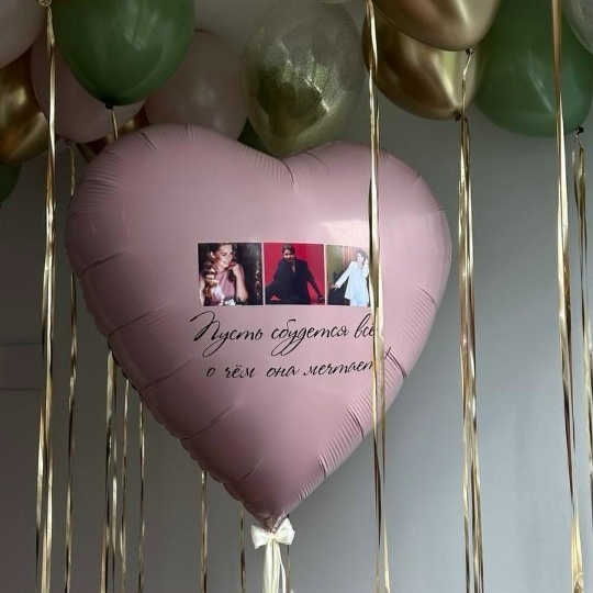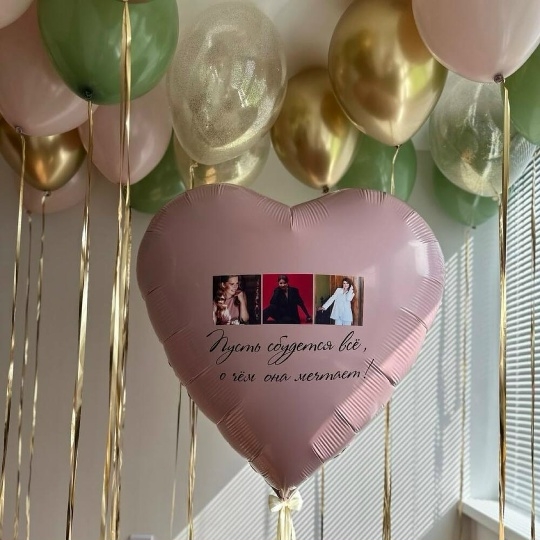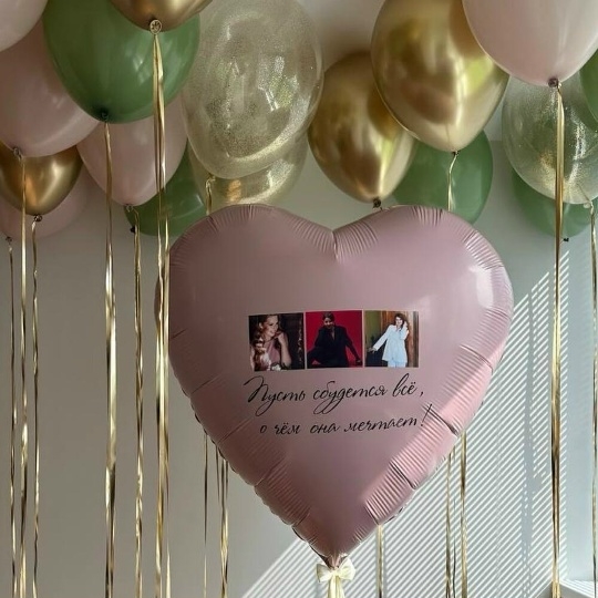В набор входит Сердце 90 см пыльная роза Фото на шар (ваше фото) Надпись на шар (ваш текст) Шар латекс 30/35 см эвкалипт 3 шт пыльная роза 3 шт Шар хром 30/35 см золото 3 шт Шар кристалл 30/35 см золото 3 шт Декор занавес дождик золото Груз 1 шт