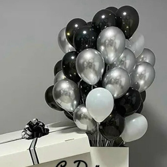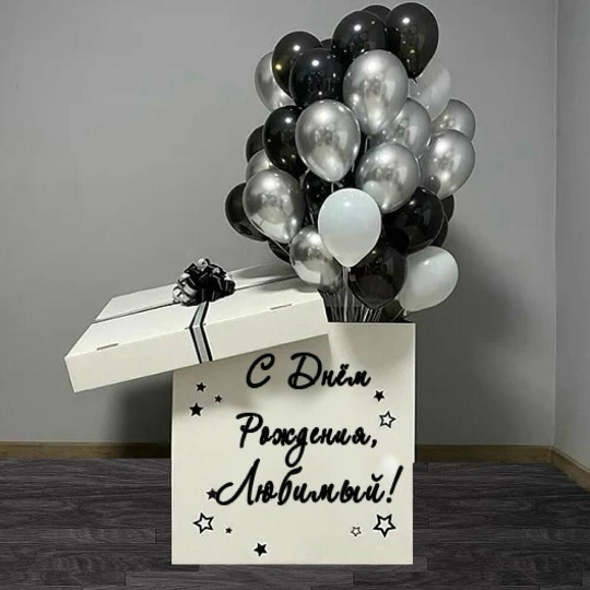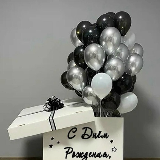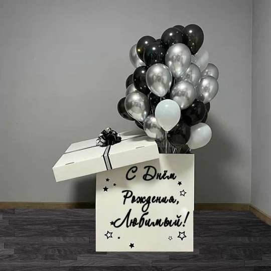 В набор входит Коробка для шаров 60/60 см Бант атласный Надпись на коробку (ваш текст) Шар латекс 10/15 см черные 13 шт белые 12 шт Шар хром 10/15 см серебро 10 шт Декор дождик серебро Коробка сюрприз, шары в коробке, коробка с шарами, набор шаров, для мужчины, для мальчика .