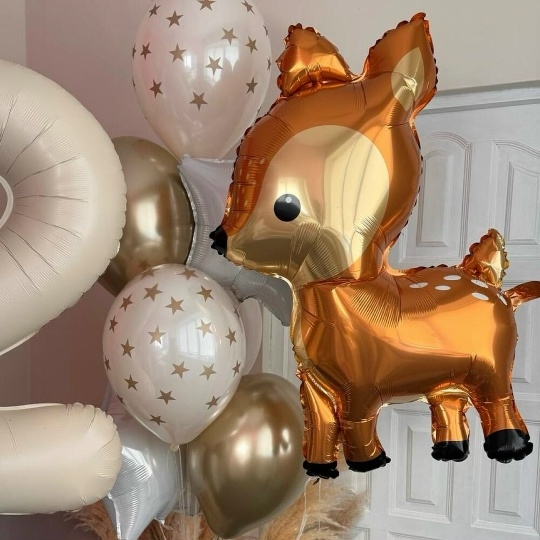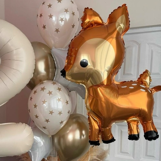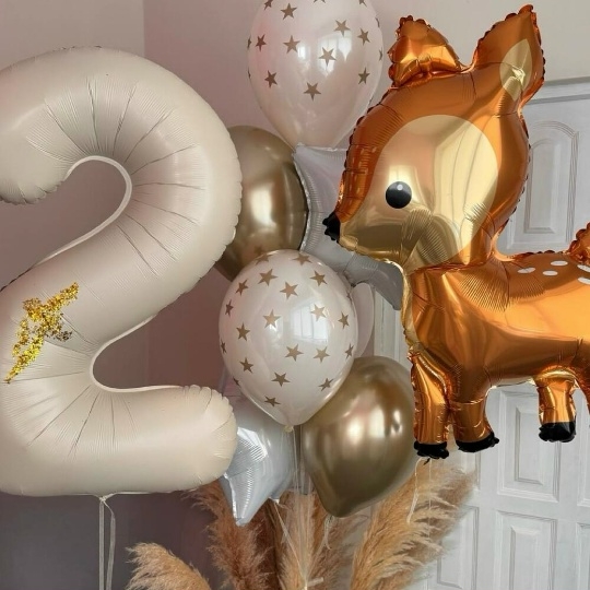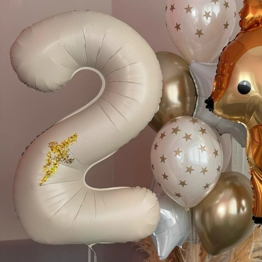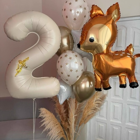 В набор входит Цифра 102 см крем Шар фигура 104 см оленёнок Шар звезда 45 см белый 2 шт Шар хром 30/35 см золото 2 шт Шар дабл 30/35 см принт звезды 2 шт Груз 3 шт Набор воздушных шаров Лесная история 👧🏼 – это волшебный подарок для маленькой принцессы, который перенесет ее в сказочный мир, полный чудес и добрых лесных обитателей! ✨ Представьте, как засияют глаза именинницы, когда она увидит эту очаровательную композицию! 💖 В центре внимания – милый золотисто-коричневый олененок 🦌 из фольги, словно заглянувший на праздник из волшебного леса. Рядом с ним красуется большая фольгированная цифра 2 бежевого цвета, сверкающая блестками ✨ и напоминающая о важном событии – дне рождения! 🎂 Воздушность и легкость композиции придают латексные шары нежных оттенков: бежевые, словно лесные тропинки, и серебристые, как лунный свет, пробивающийся сквозь кроны деревьев. Золотистые звезды 🌟 на шарах добавляют волшебства и мерцания, создавая атмосферу настоящей сказки. ✨ для девочки, шар олененок, шары для девочки