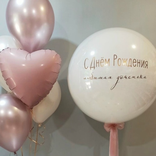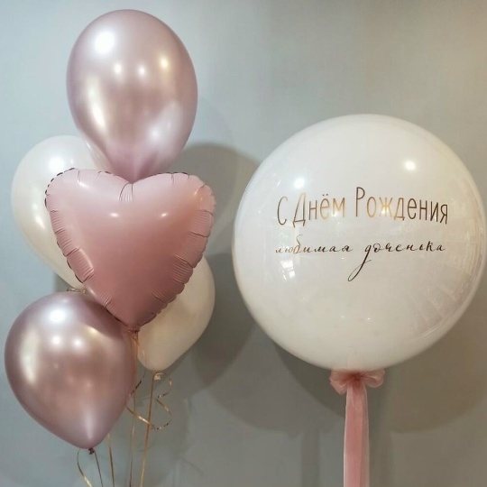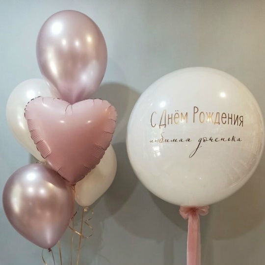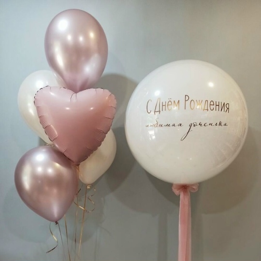 В набор входит Шар дабл стафф 60/65 см белый Надпись на шар ( ваш текст) Шар хром 30/35 см розовый 2 шт Шар дабл 30/35 см белый 2 шт Сердце 45 см пыльная Роза 1 шт Груз 2 шт