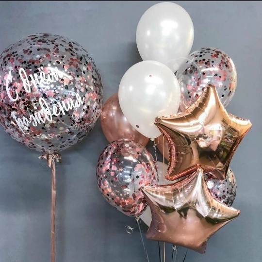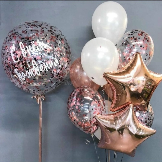 В набор входит Шар баблс 60/65 см Надпись на шар 25 см Конфетти микс Шар латекс 30/35 см белый 3 шт Шар хром 30/35 см розовое золото 2 шт Шар кристалл 30/35 см 3 шт конфетти микс Звезда 45 см розовое золото 2 шт Груз 2 шт все шары только премиум сегмента, обработаны гелем для увеличения срока полёта, доставляются в транспортировочных пакетах.